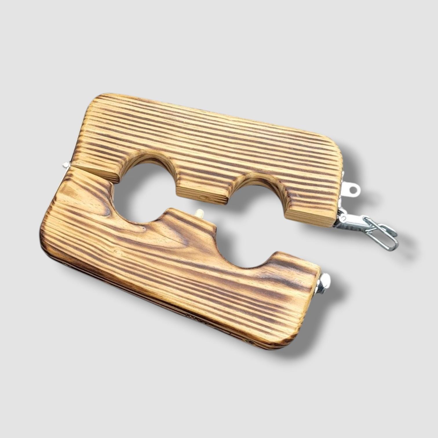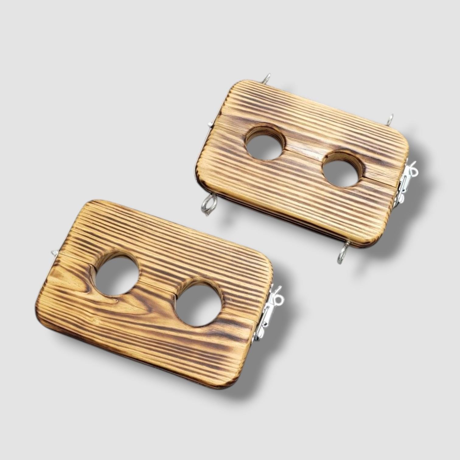Stock dimensions: 13" Long, 8" Wide, 1.5" Thick. Wrist holes are 2 1/4" or 2 1/2" diameter. Other hole sizes are available upon request.