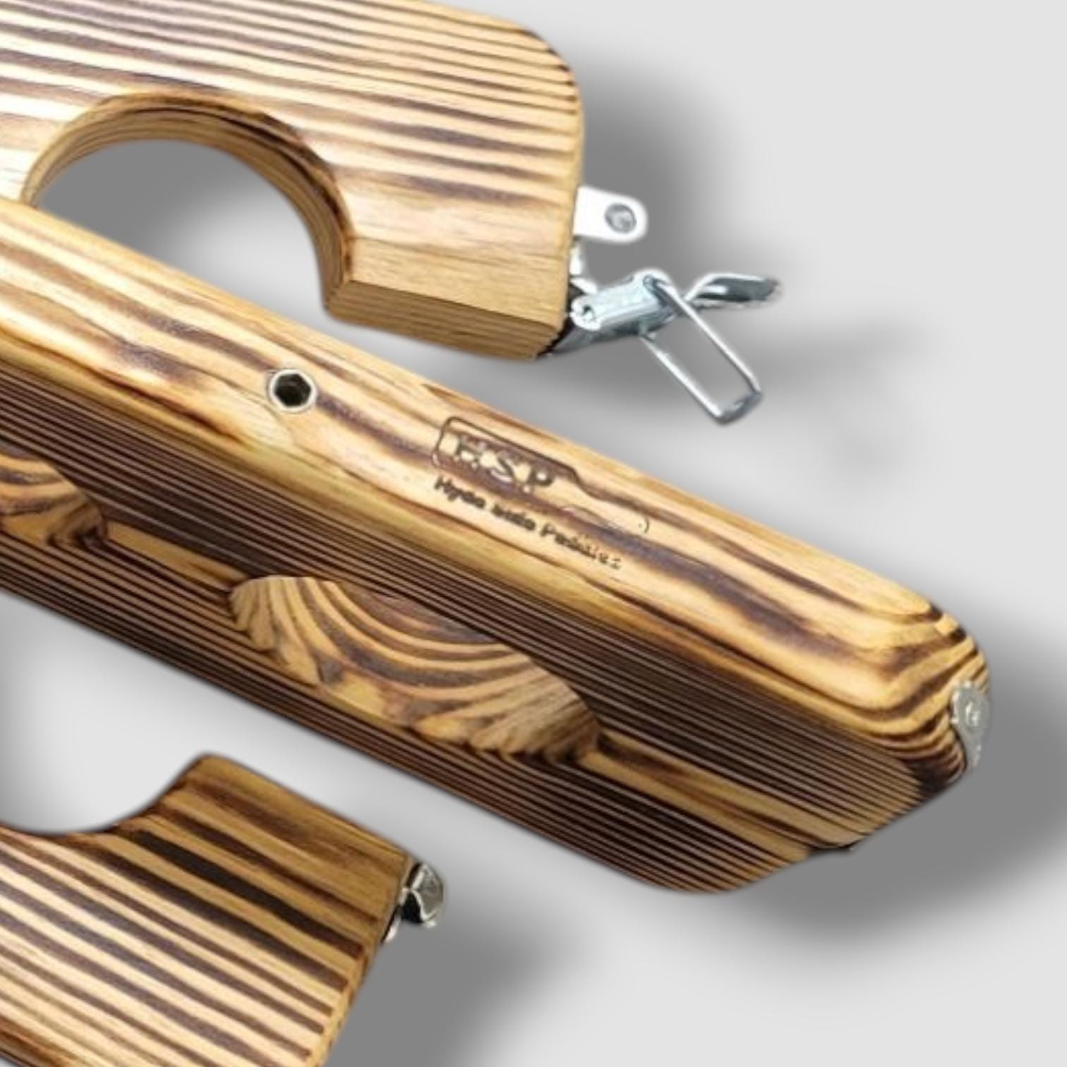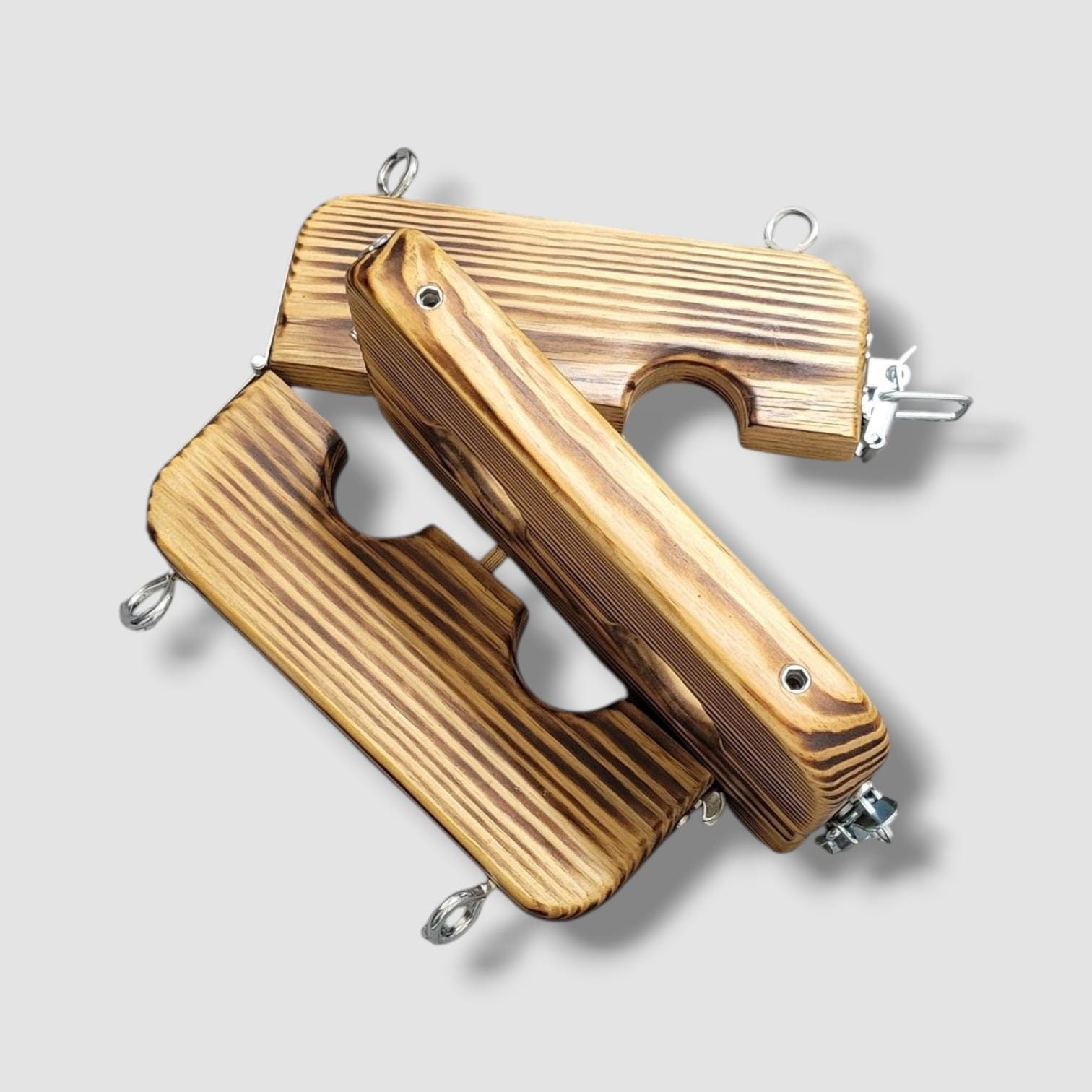 Stocks are crafed from pine, torch burnt and sanded, then finished with matte acrylic.